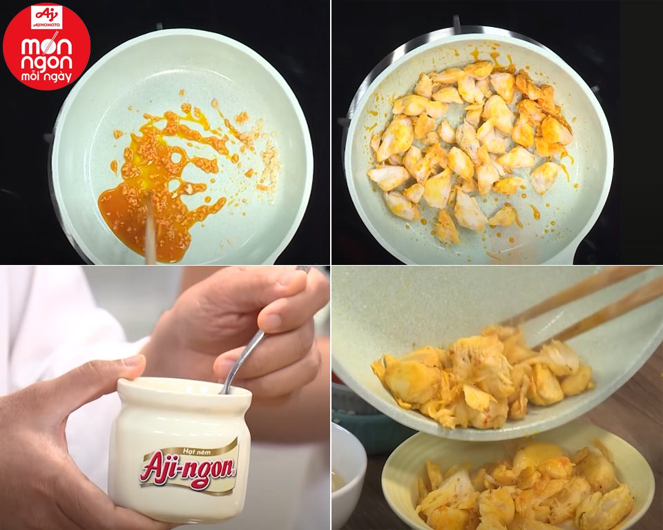 • Cho 1/2M dầu màu điều vào chảo sau đó cho 1m gừng băm vào phi thơm, tiếp theo cho thịt cua vào xào thơm cùng ít tiêu trắng, 1/3m Hạt nêm Aji-ngon Heo, sau đó cho ra chén.