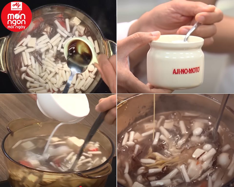 • Nêm thêm 1/2m đường phèn, 1.5m bột ngọt AJI-NO-MOTO®, 1M hạt nêm Aji-ngon Heo và 1/2 M dầu hào, sau đó đun sôi vớt bọt.