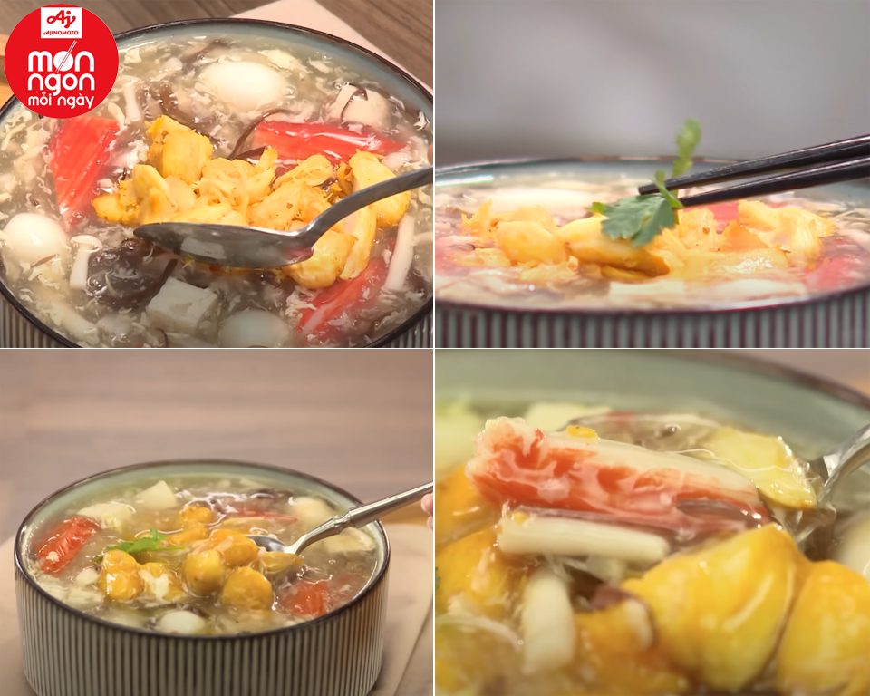 Nước súp cua sánh sệt, beo béo bùi bùi của thịt cua, thanh cua và trứng, kèm thêm là đậu hũ và nấm thanh đạm, mộc nhĩ giòn dai sạch mùi tanh; tất cả hòa chung lại sẽ tạo nên mốt món ngon đầy đủ dinh dưỡng.