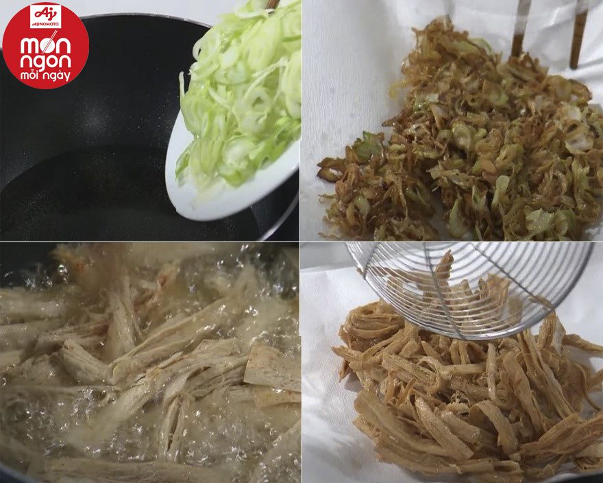 - Sườn chay ngâm mềm, xé sợi, ướp với 1 ít tiêu, 1 ít ớt bột, chiên vàng giòn.
