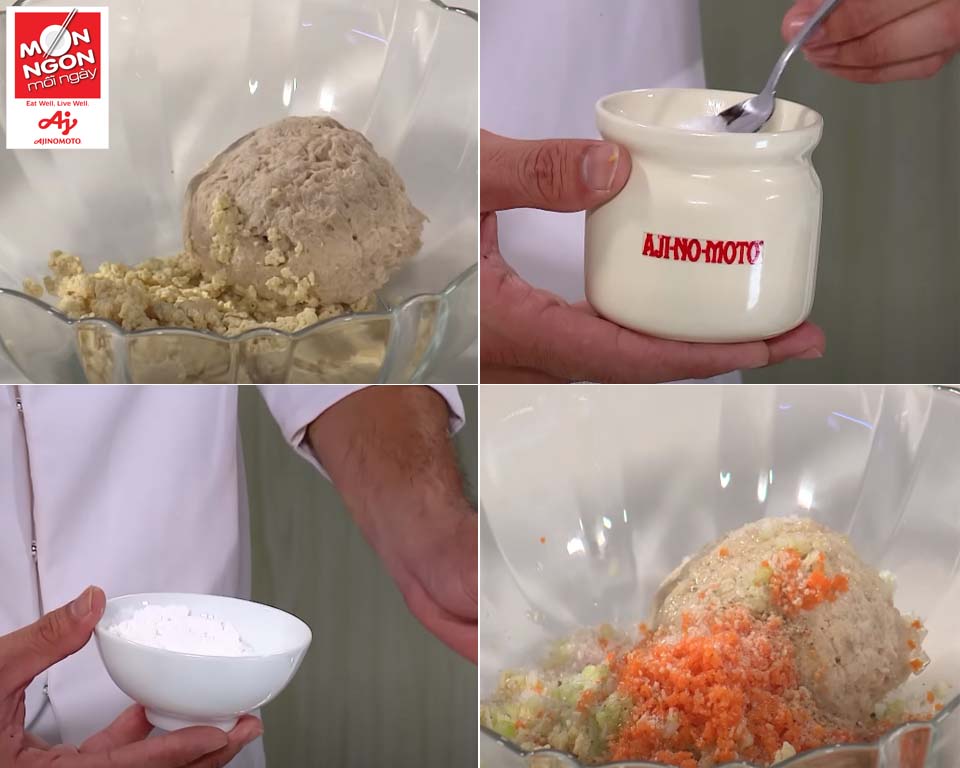 - Trộn đều đậu hũ trắng, giò sống gà chay, 2M hành boaro, 2M cà rốt.