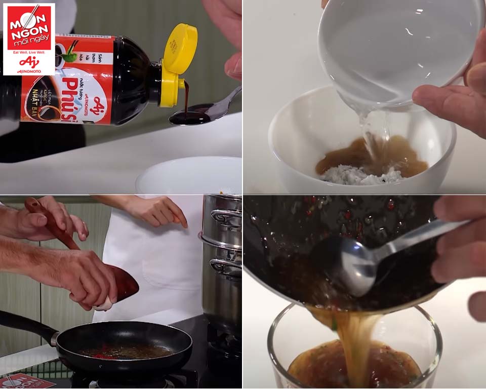 - Hòa tan 1/2m đường, 1/2m Bột ngọt AJI-NO-MOTO®, 1/3m muối, 1m Hạt nêm Aji-ngon® Nấm, 1m dầu hào chay, 2m bột năng và 1 chén nước, 1m Nước tương “Phú Sĩ”.