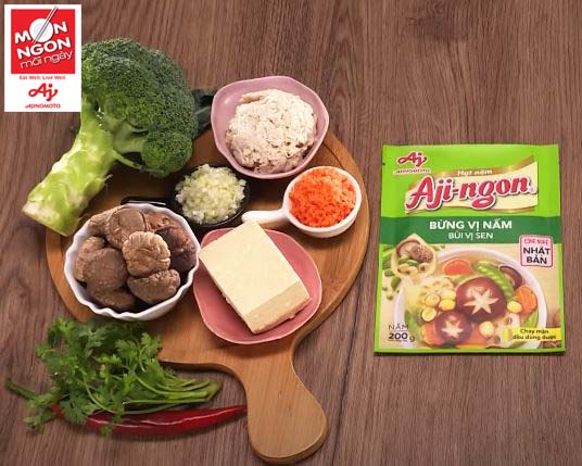 - Gia vị: Bột năng, dầu hào chay, dầu ăn, dầu mè, Bột ngọt AJI-NO-MOTO®, Nước tương “Phú Sĩ”, Hạt nêm Aji-ngon® Nấm.