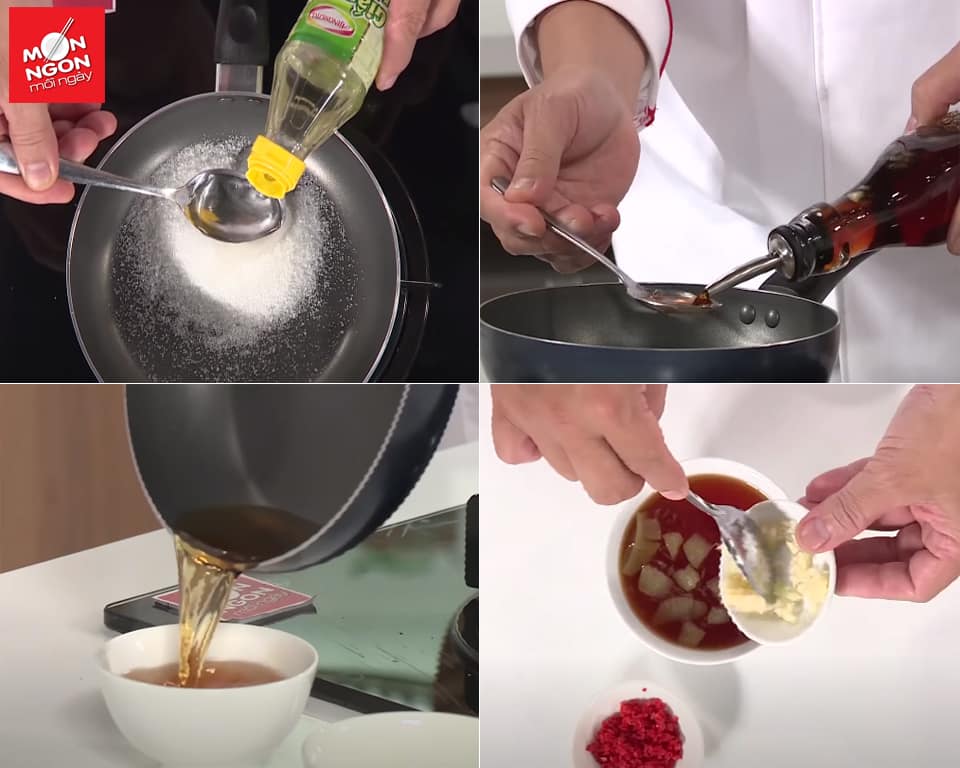 • Nấu tan 4M đường, 4M nước mắm, 8M nước, 2M Giấm gạo lên men LISA®, 2m Bột ngọt AJI-NO-MOTO® để nguội.