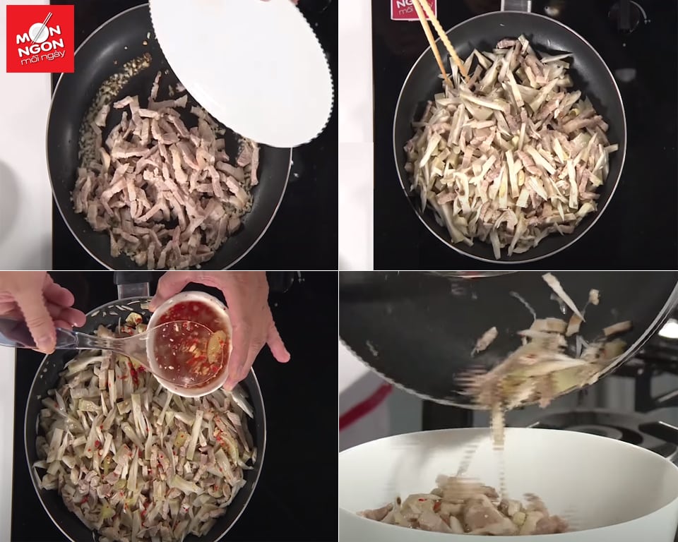 • Phi thơm tỏi, cho thịt và mít vào xốc nhanh, tắt lửa cho 1/2 nước mắm trộn gỏi vô đảo đều, để nguội.