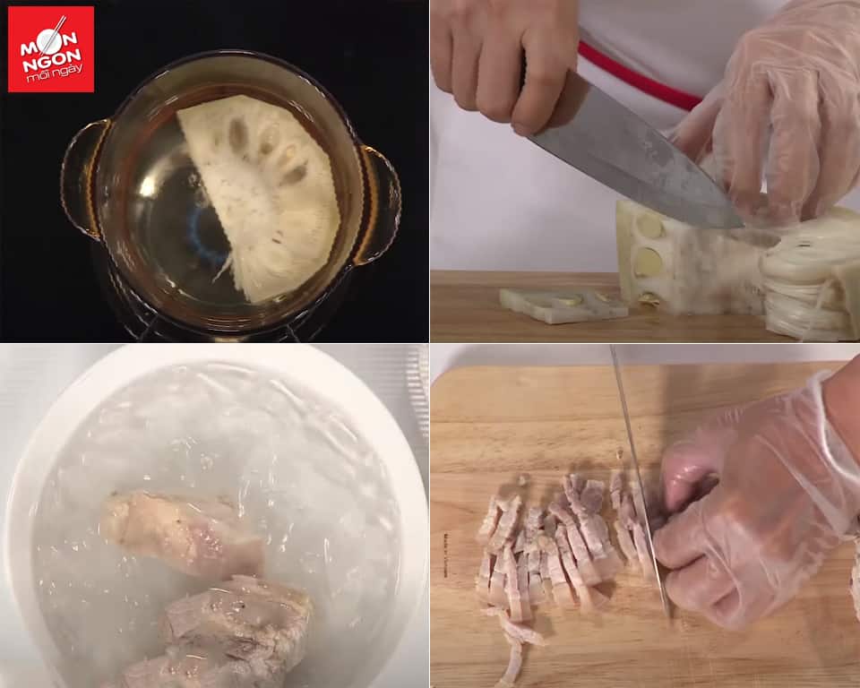 • Thịt luộc chín, để nguội rồi cắt sợi bản 0.5cm.