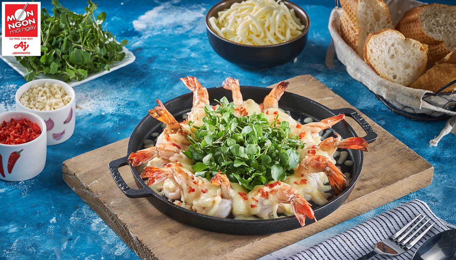 ✅ Đậy nắp đến khi phô mai vừa chảy thì mở nắp để tôm không ra nước.