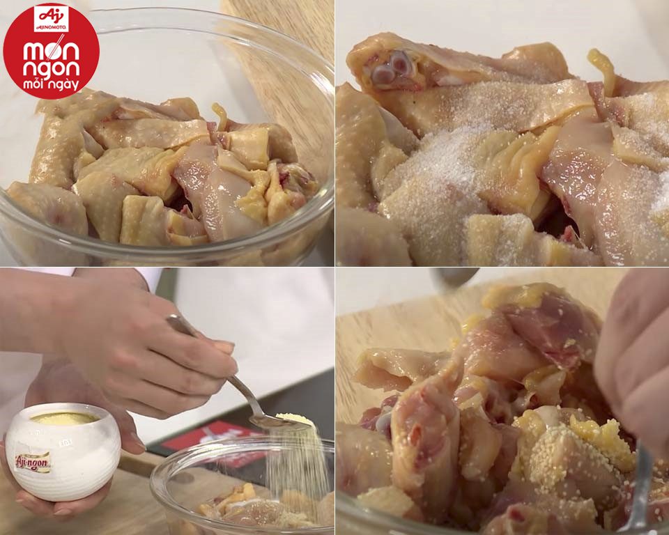 - Ướp gà với 1/3m muối, 1M Hạt nêm Aji-ngon® Gà, để thấm khoảng 20 phút.