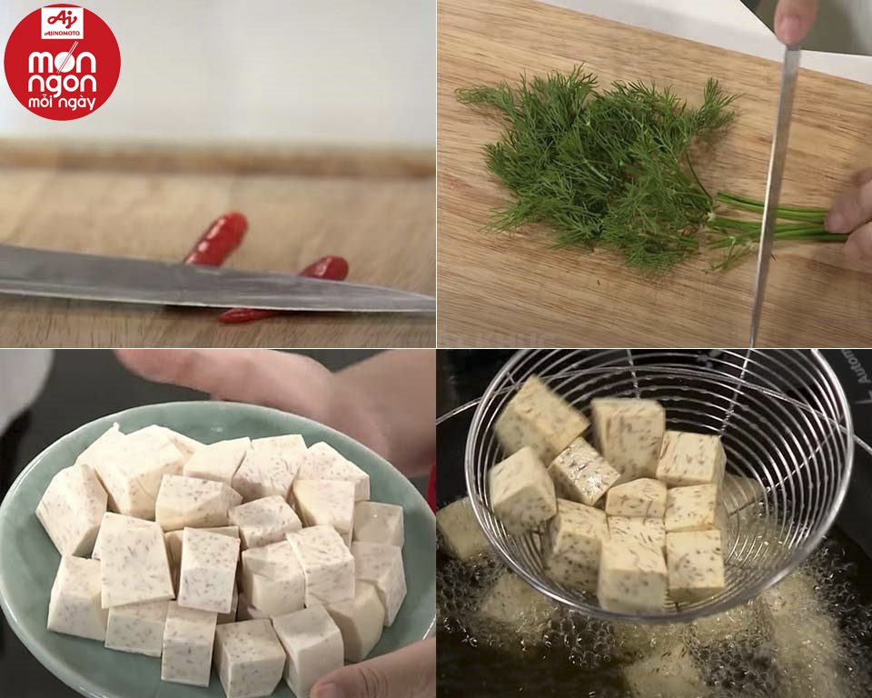 - Khoai môn cau gọt vỏ, cắt khối 2cm, sau đó đem chiên vàng.