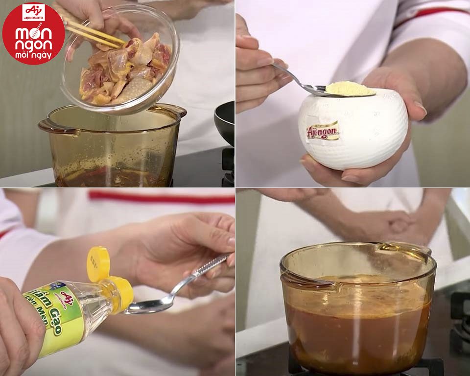 - Cho gà vào xào săn, rồi thêm 1,2 lít nước vào đun sôi, nêm 1/3m Bột ngọt AJI-NO-MOTO®, 1/2M Hạt nêm Aji-ngon® Gà, 1,5M đường, 1M nước mắm, 3M Giấm gạo lên men Ajinomoto.