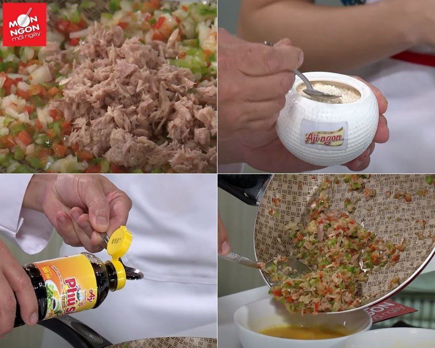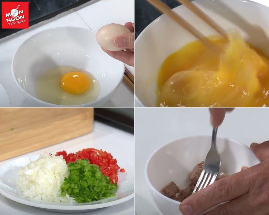 • Trứng gà: đập ra 2 tô riêng, mỗi tô 4 quả, đánh tan. Cá ngừ bỏ dầu, tán nhuyễn. Hành tây, ớt chuông xanh đỏ cắt hạt lựu nhuyễn.