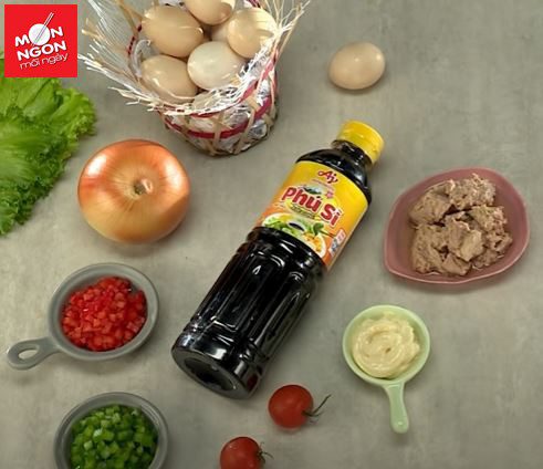• Trứng gà ta: 8 quả; Cá ngừ ngâm dầu: 1/2 hộp; Hành tây: 30g; Ớt chuông xanh: 30g; Ớt chuông đỏ: 30g;